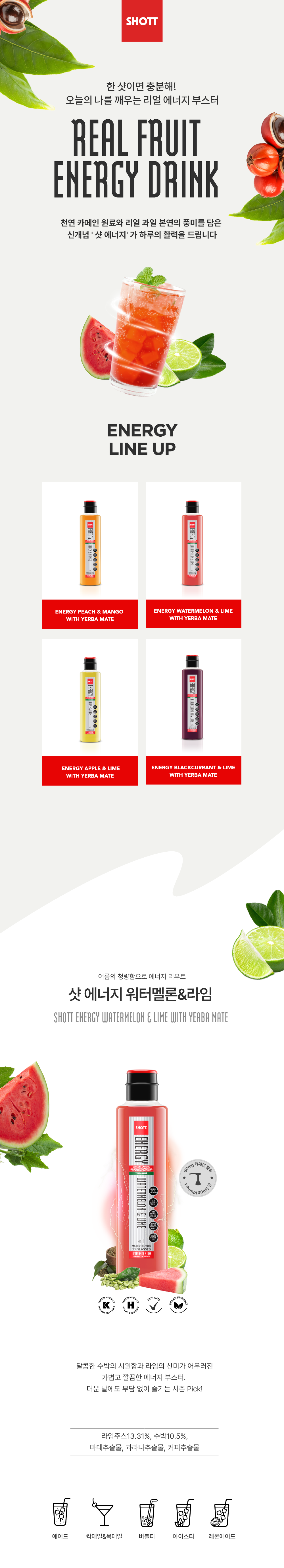 '샷 에너지 워터멜론&라임'은 달콤한 수박의 시원함과 라임의 산미가 어우러진 가볍고 깔끔한 에너지 부스터. 더운 날에도 부담 없이 즐기는 시즌 Pick!