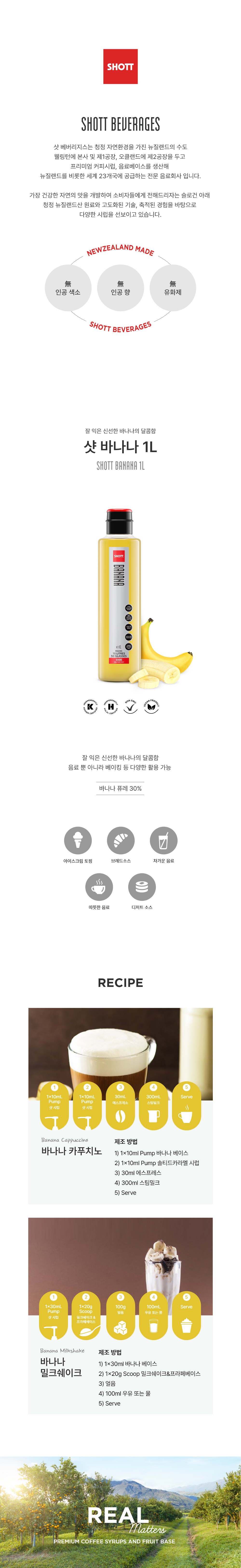 ‘샷 바나나’는 잘 익은 바나나의 신선한 맛을 그대로 담고있어, 우유가 들어 있는 음료와 최상의 매치를 자랑합니다.